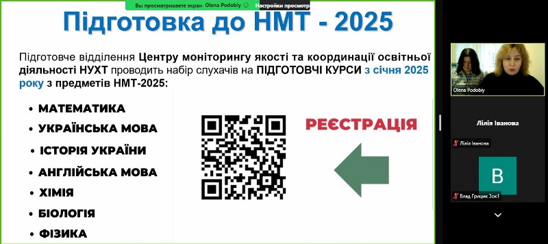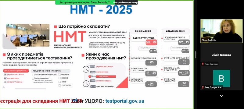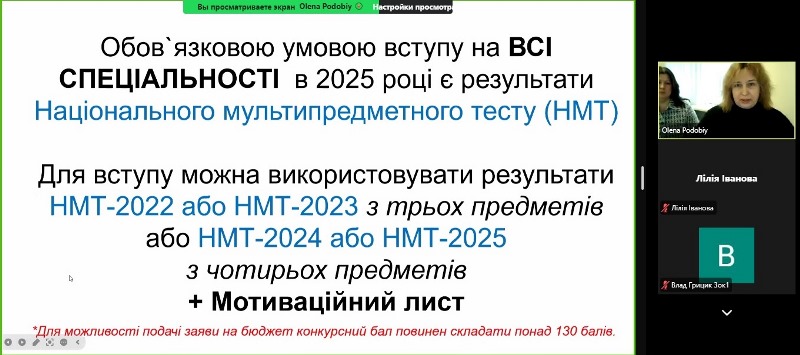 Велику увагу відповідальна секретарка Приймальної комісії приділила НМТ-2025, акцентувала увагу на ключових датах і необхідності уважного внесення даних при реєстрації, оскільки на коригування інформації відведено дуже мало часу. Фахівчиня розповіла про підготовчі курси університету до складання НМТ і роз’яснила, як навчання на них може допомогти підвищити конкурсний бал при вступі; навела спеціальності, яким надається особлива підтримка держави та надала контакти комунікаційних каналів і консультаційного центру для вступників, де вони зможуть і слідкувати за всіма новинами вступної кампанії, і ставити свої запитання, і отримувати консультації та допомогу при поданні документів.