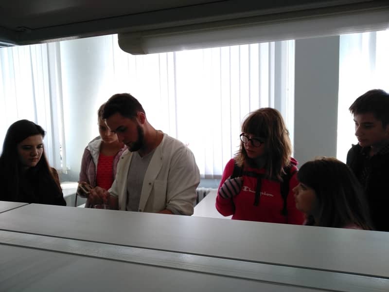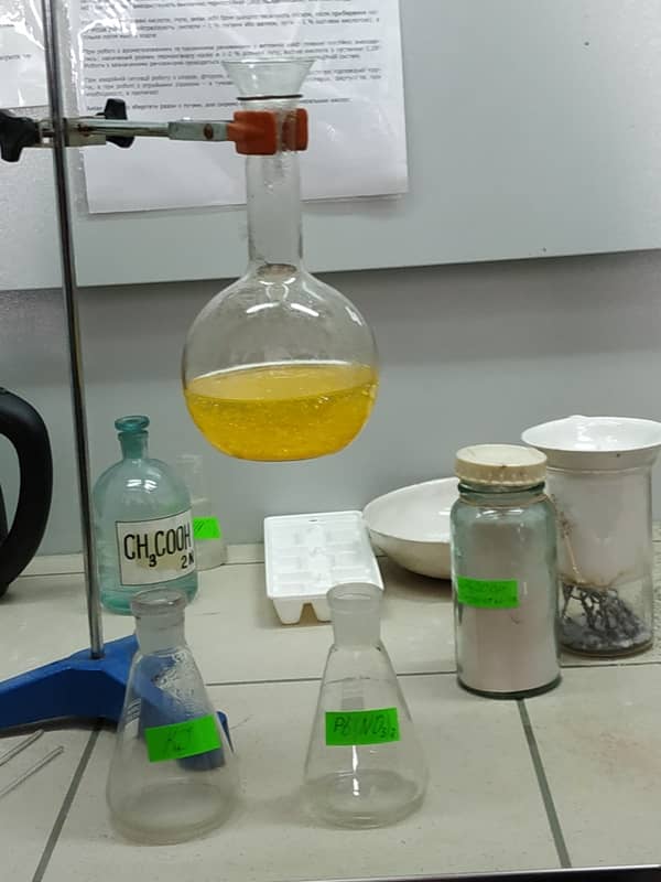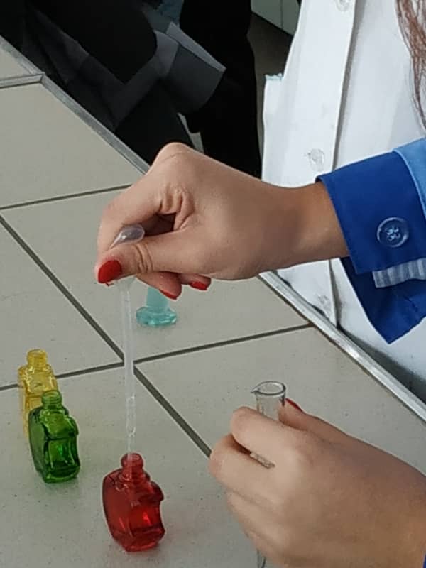 Студентка групи ХТ-4-4 Лаура Овакімян ділилася секретами технології отримання нових ароматів. А це зовсім не просто. Необхідно розвивати, як хімічні навички, так і мати гарні знання з органолептичного аналізу та інших суміжних дисциплін. Магістрант групи ХТ-2-5М Павло Назарчук показував чудові теоретичні і практичні знання, демонструючи майбутнім вступникам секрети отримання шампуню. А студенти групи ХТ-4-4 Анастасія Терещенко та Анна Панченко демонстрували цікаві хімічні досліди: на дно пробірок випадав величавий золотий дощ, а поряд йшло бурхливе виверження вулкана.