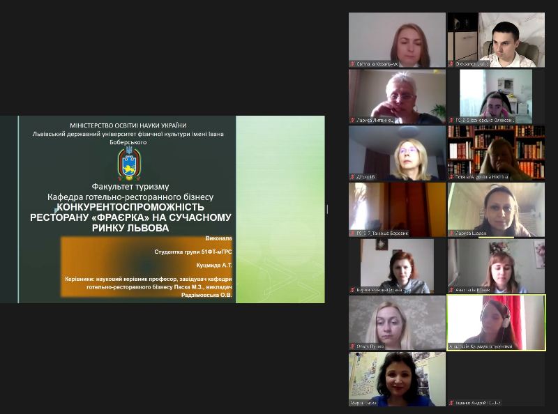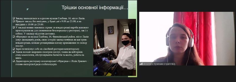 Магістрантка спеціальності 241 «Готельно-ресторанна справа» Львівського державного університету фізичної культури ім. І. Боберського Анастасія Кумцида під керівництвом завідувачки кафедри готельно-ресторанного бізнесу, професорки Марії Паски акцентувала увагу в своїй доповіді на конкурентоспроможності закладу харчування в умовах сьогодення на прикладі ресторану «ФРАЄРКА» м. Львова.