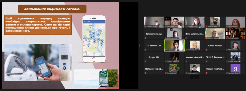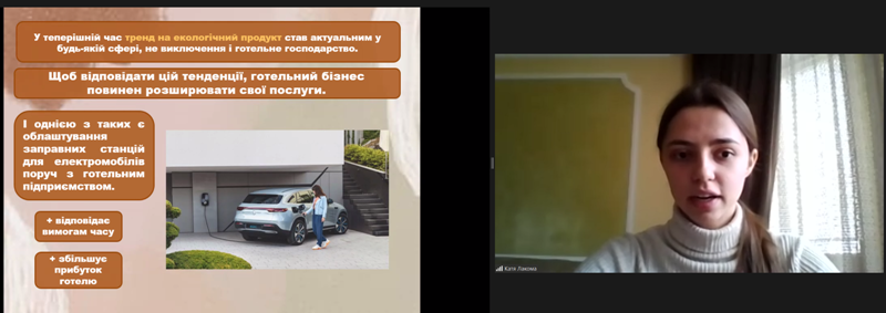 Аспірантка 3-го року навчання Анастасія Різник та здобувачі освітнього рівня магістра та бакалавра спеціальності 241 «Готельно-ресторанна справа» Тетяна Туз, Вікторія Ганущак, Катерина Лакома разом із керівниками свої наукові дослідження представили за тематиками: доцільність використання вівсяного толокна технології хлібних виробів для закладів ресторанного господарства; роль соціальних мереж у просуванні готельного продукту на ринок; доцільність облаштування зарядних станцій для електромобілів при готельних підприємствах.