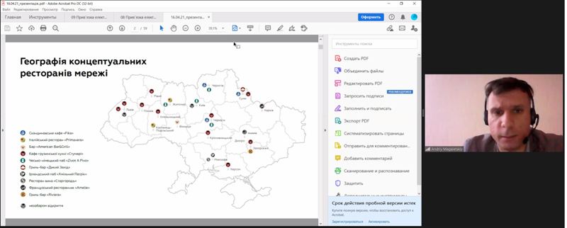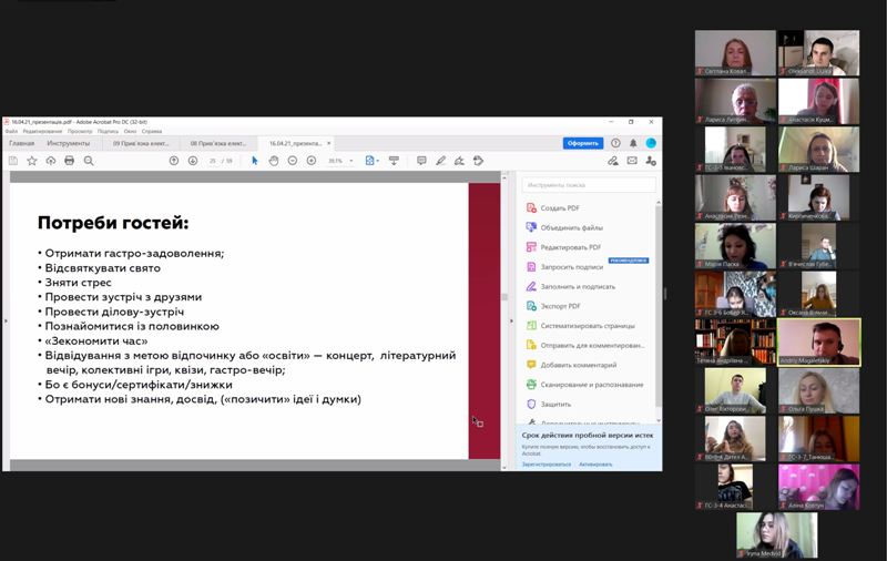 15 квітня 2021 р. із використанням сучасного інструментарію для організації відеоконференцій відбулося засідання секції «Готельно-ресторанний та туристичний бізнес» підсекції «Готельно-ресторанна справа» 87-ї Міжнародної наукової конференції молодих учених, аспірантів і студентів «Наукові здобутки молоді – вирішенню проблем харчування людства у ХХІ столітті».