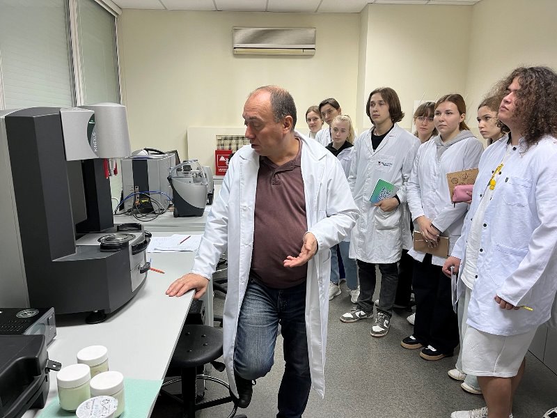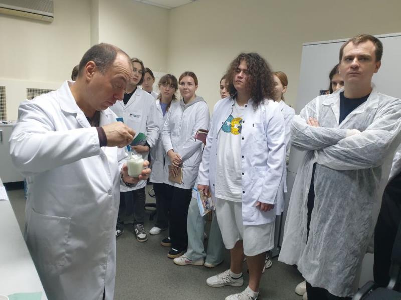 Під час першої половини лабораторного заняття на тему «Контроль якості кисломолочних продуктів та морозива» професорка Оксана Кочубей-Литвиненко ознайомила здобувачів із правилами відбору проб і підготовкою їх до аналізу, методиками визначення якісних характеристик ферментованих молочних продуктів. Навчившись контролювати якість кефіру, йогурту, ряжанки та сметани класичними стандартними методами в лабораторних умовах кафедри технології молока і молочних продуктів та встановлювати їх відповідність чинним нормативним документам, здобувачі вирушили до науково-дослідної лабораторії.