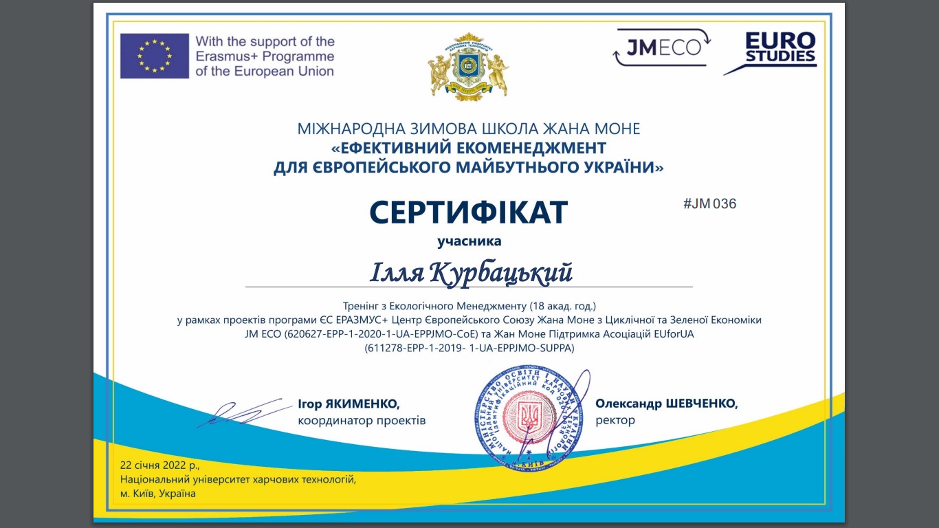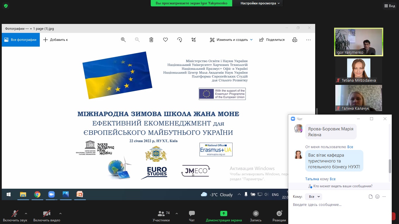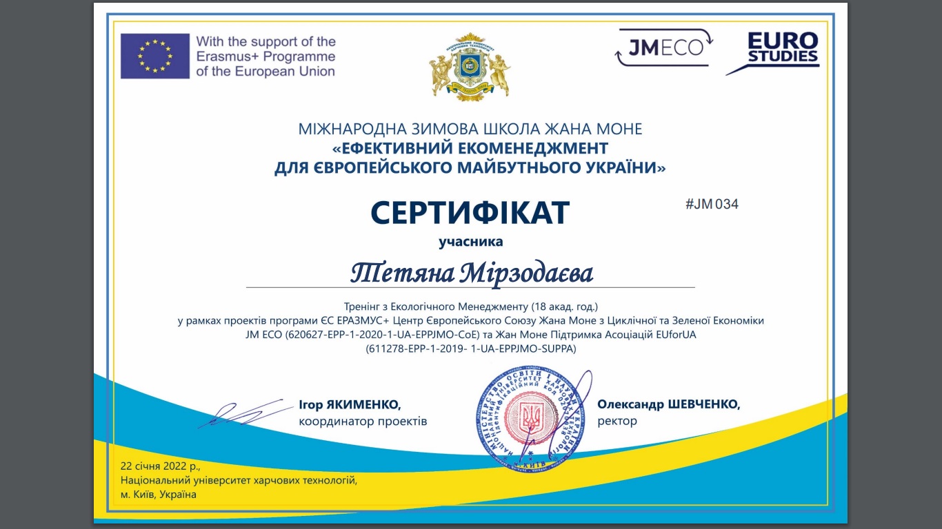 Магістри спеціальності «Туризм» разом із доценткою кафедри туристичного та готельного бізнесу Тетяною Мірзодаєвою в рамках вивчення дисципліни «Управління стійким розвитком дестинацій: досвід ЄС» успішно пройшли навчання у Міжнародній Зимовій Школій Жана Моне: Університет – Школі «Ефективний Екоменеджмент для Європейського Майбутнього України».