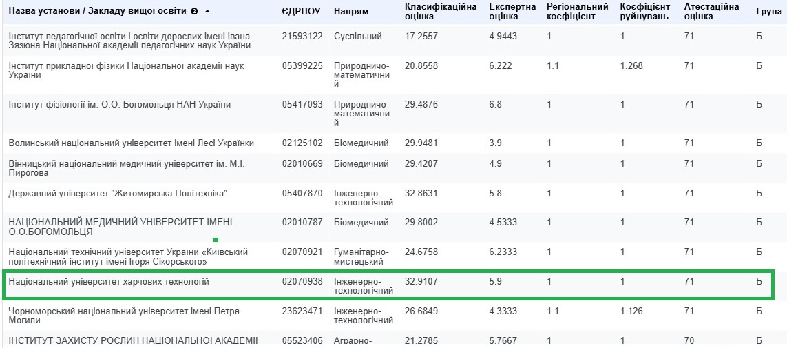 Наш університет увійшов до вищої атестаційної групи Б (від 50% включно до 75 %) з показником 71% та експертною оцінкою 5,9. При атестації враховувалися якість публікаційної активності наших учених, участь у наукових і науково-технічних проєктах, зокрема на замовлення бізнесу та виконання державних і міжнародних грантів, підготовка наукових кадрів, залучення фінансування та підтверджений вплив наукових результатів на розвиток економіки, обороноздатність, розвиток науки і суспільства.