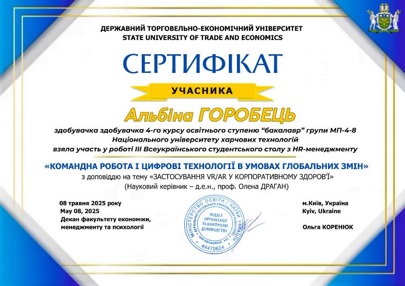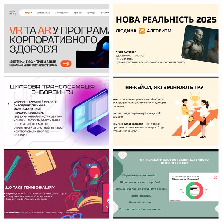 Учасники з Державного торговельно-економічного університету, Донецького національного університету імені Василя Стуса, Львівського торговельно-економічного університету та Національного університету харчових технологій представили цікаві доповіді, презентації та взяли участь в обговореннях з актуальних питань HR-менеджменту. Особливу увагу аудиторії привернули дослідження: «Командна робота та адаптивне лідерство в умовах воєнного стану» (Анастасія та Христина Стельмах, Марія Притуляк, Аделіна Плахотнік, Максим Корбачов, Любов Вижга), «Цифровізація та гейміфікація в управлінні персоналом» (Діана Савченко, Сніжана Сивець, Вікторія Корнєва, Софія Шимін), «Штучний інтелект в освіті та HR-сфері» (Кирило Оленюк, Ольга Самчук, Карина Жуковська), «VR/AR-технології у корпоративному здоров’ї» (Альбіна Горобець), «Гендерна рівність та інклюзія в HR-політиці підприємств» (Олександра Штурмак).