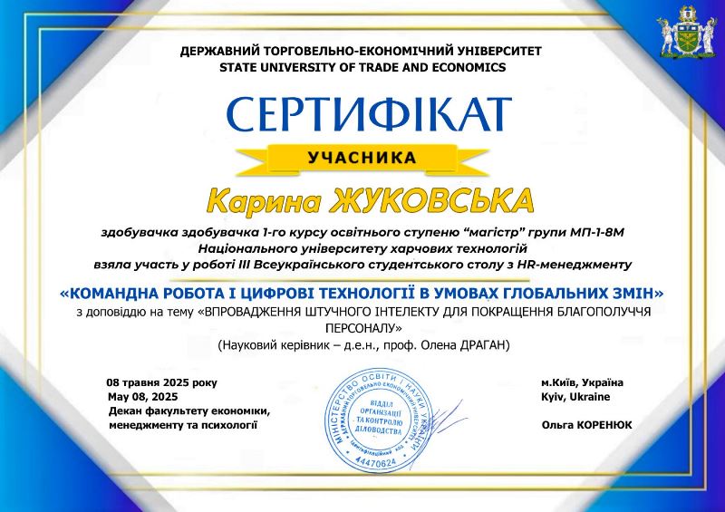 Здобувачки освітньої-професійної програми «Менеджмент персоналу» Альбіна Горобець (група МП-4-8) і Карина Жуковська (група МП-1-8М) представили свої доповіді на ІІІ Всеукраїнському студентському круглому столі з HR-менеджменту «Командна робота і цифрові технології в умовах глобальних змін». Модераторами заходу виступили викладачі кафедри менеджменту Державного торговельно-економічного університету: завідувач кафедри, д-р екон. наук, професор Сергій Бай, д-рка екон. наук, професорка Валентина Жуковська та канд. екон. наук, доцентка Ірина Миколайчук.
