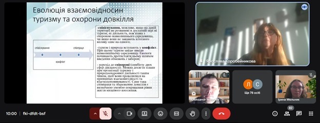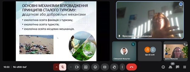 Спікерка акцентувала увагу на впливах екологічного стану навколишнього середовища на розвиток туризму, окреслила проблему овертуризму як одну з найбільших загроз для природного середовища та культурної спадщини, а також визначила екологічну безпеку туристичних дестинацій у системі сталого розвитку як ключову умову збалансованості чинників розвитку природного середовища.