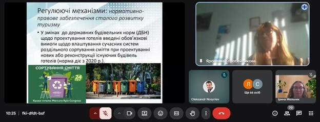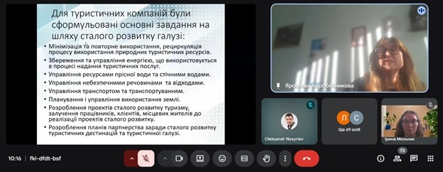 Лекція стала важливим етапом у підготовці майбутніх фахівців, які зможуть упроваджувати принципи сталого розвитку та екологічної безпеки у сфері туризму, забезпечуючи збалансованість природного середовища та розвиток туристичних дестинацій відповідно до глобальних цілей сталого розвитку.