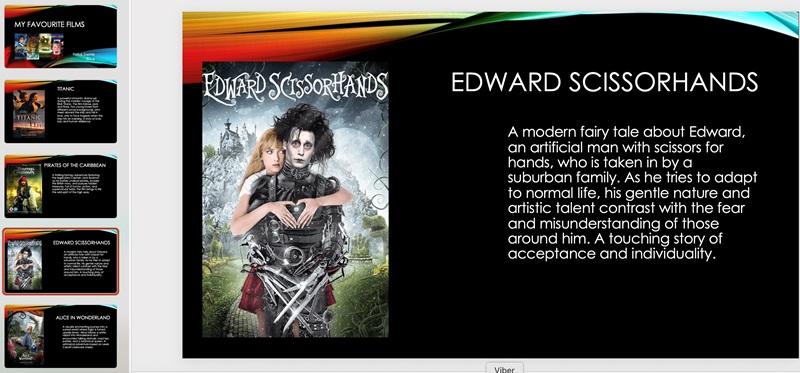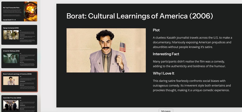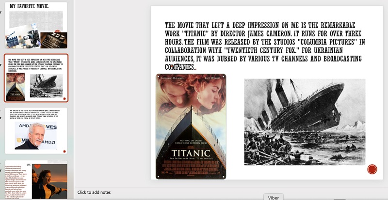 Студенти презентували свої улюблені кінострічки англійською мовою, розповідаючи про сюжет, жанр, акторський склад, а також про те, чим саме цей фільм або серіал їх зацікавив. Захід поєднав вивчення мови з обговоренням сучасної культури, а також допоміг розвинути навички публічного мовлення та аналітичного мислення.