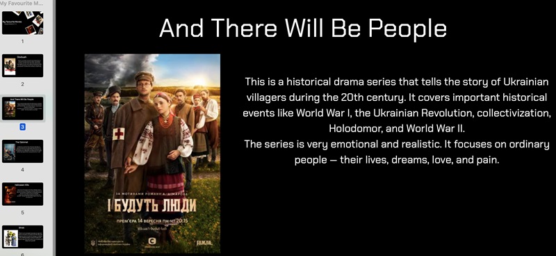 Під час чергового заняття з англійської мови здобувачі освіти групи ТІ-1-4 разом із викладачкою кафедри іноземних мов професійного спрямування Юлією Ткачук провели тематичну презентаційну сесію, присвячену улюбленим фільмам і серіалам.