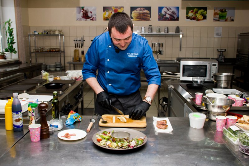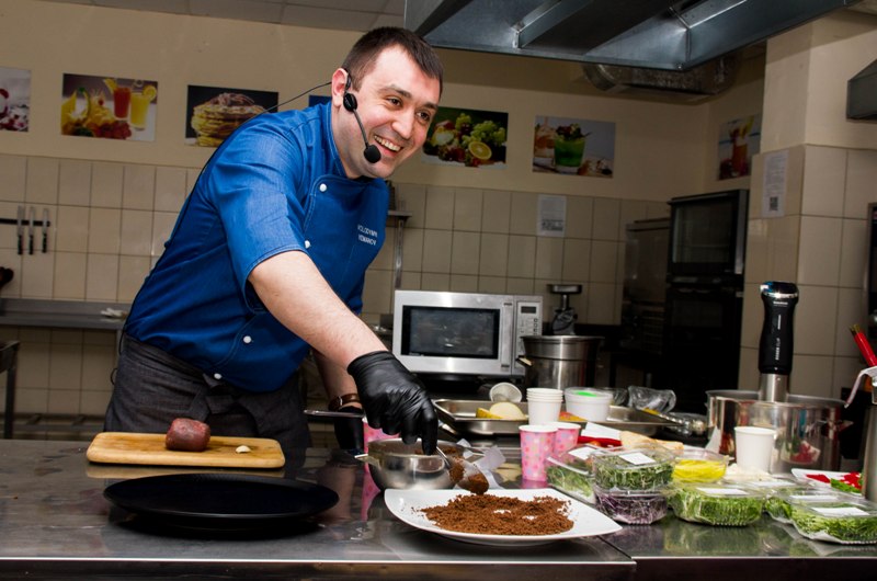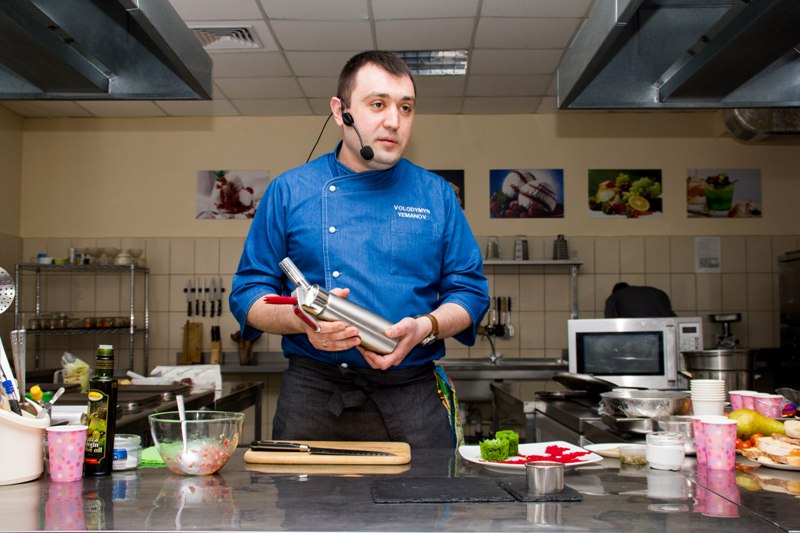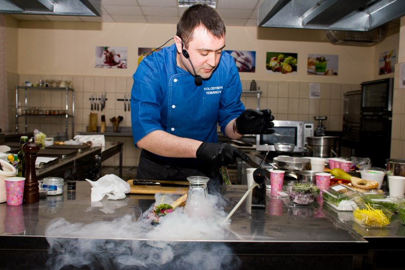 Володимир Єманов представив до уваги присутніх технології ресторанної продукції з використанням комбінованих технік і креативною презентацією: закуску з маринованим лососем «Гравлакс», закуску тар-тар із яловичини, ростбіф Sous Vide з їстівним ґрунтом, салат із качиним філе Sous Vide, шоколадний фондан із морозивом із зеленого чаю. Кожна з приготованих страв – неймовірне поєднання смаку, аромату і зовнішнього викладу, шедевр модерного кулінарного мистецтва. У центрі уваги шеф-кухаря була низькотемпературна технологія Sous Vide, копчення зі Smoking Gun, еспумізація і заморожування з рідким азотом. Професіонал у своїй справі, шеф-кухар говорив про необхідне сучасне устаткування для закладів ресторанного господарства, режими низькотемпературного оброблення за Sous Vide-технологією і його переваги, особливості використання рідкого азоту для заморожування і оригінальної презентації страв.