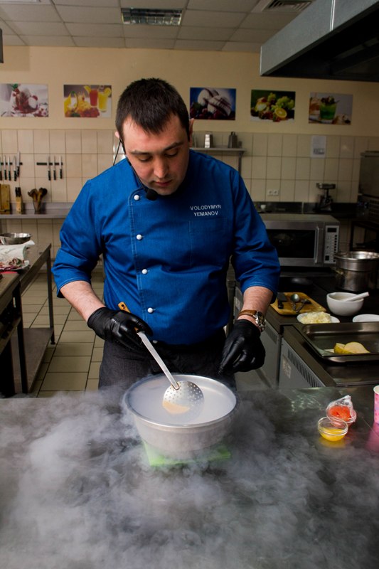 Володимир Єманов – шеф із великим досвідом, теоретичними знаннями та практичними вміннями, натхненний і захоплений своєю справою. Талановитий професіонал розкрив для наших студентів таємниці молекулярної гастрономії, подарував яскраві враження і емоції, а також дозволив закріпити у найкращій спосіб теоретичні знання і вміння.