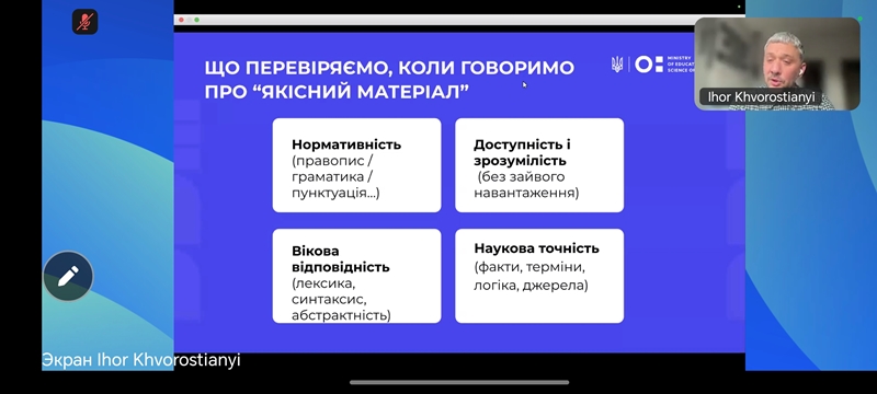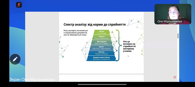 Учасники курсу отримали практичні рекомендації щодо формування змісту сучасної навчальної літератури, забезпечення її наукової достовірності та мовно-стилістичної коректності, а також алгоритми проведення антидискримінаційної експертизи та врахування вимог доступності для учнів із особливими освітніми потребами. Окрему увагу приділено принципам універсального дизайну, особливостям роботи з інтегрованими курсами та професійній взаємодії в експертних комісіях.