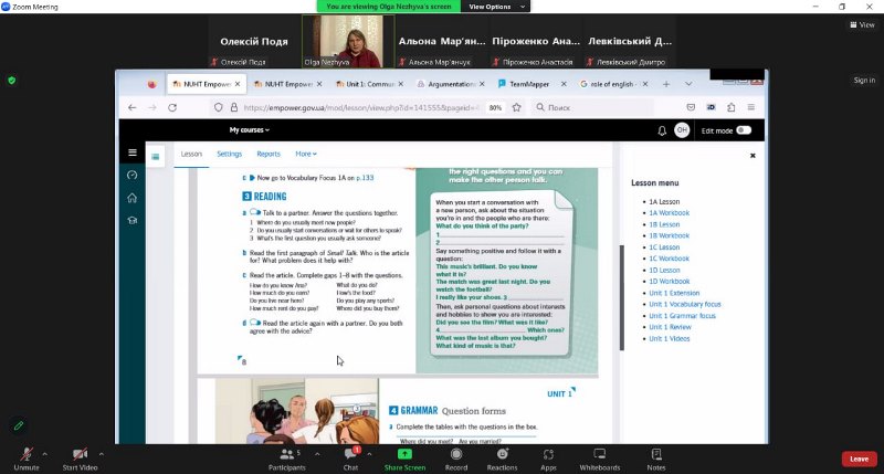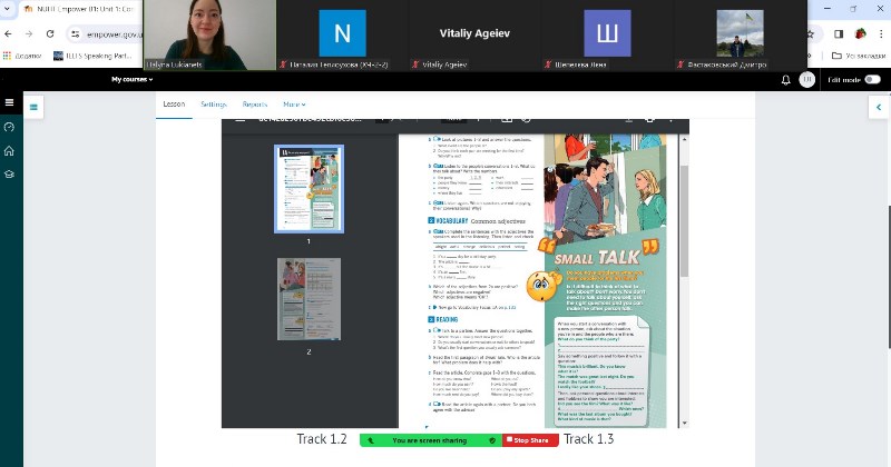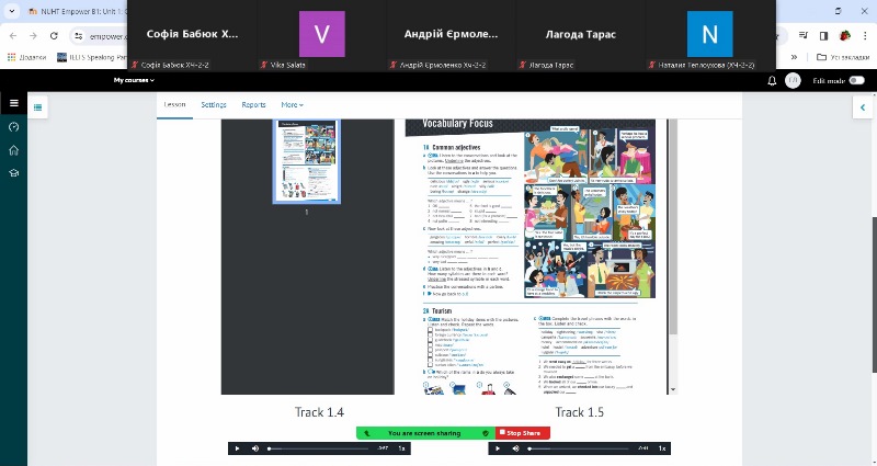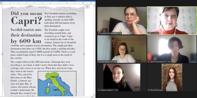 Здобувачі першого курсу, групи ГС 1-9а, що навчаються за спеціальністю «Готельно-ресторанна справа», разом із доценткою Інною Форостюк також знайомляться з Кембриджським курсом. На занятті вони відпрацьовували мовленнєві навички, обговорюючи теми, близькі до їхнього фаху – ситуації , які можуть трапитися з гостями під час їхньої подорожі. Цікавий матеріал курсу є корисним доповненням до щотижневих занять.