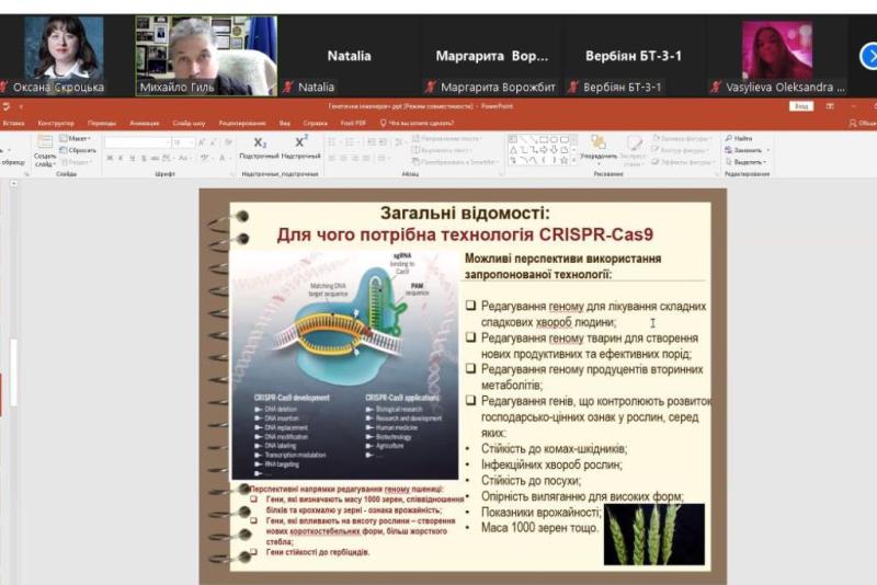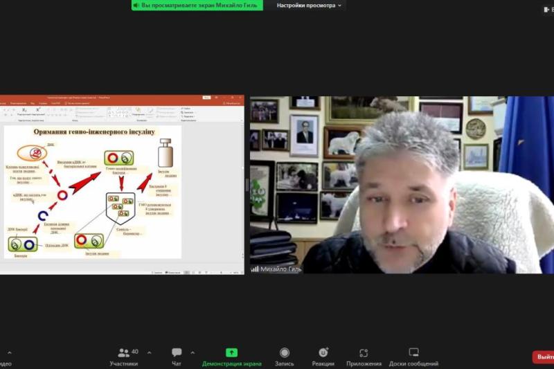 У сучасному світі для біотехнолога роботи більш ніж вистачає, особливо якщо справа йде про роботу, пов’язану з генною інженерією. За менш ніж півстоліття генна інженерія перетворилася з чогось на межі фантастики в абсолютно практичну технологію, що вже застосовується по всьому світу в різних галузях економіки – сільському господарстві, харчовій промисловості, фармації та мікробіологічній промисловості. Тож, професор Гиль, як людина, що має неабиякий досвід у цій сфері, повідав здобувачам освіти про багато аспектів сучасної генетичної інженерії – розповів про виробництво ліків за допомогою генетично вдосконалених бактерій, про отримання м’яса зі стовбурових клітин, що за тисячі доларів подають в елітних ресторанах Дубаю та Сінгапуру, але вже скоро воно дозволить всьому людству їсти бургери та стейки, не витрачаючи величезні площі земної поверхні під пасовиська і не забиваючи тварин. Розповів лектор і про те, як генетики створювали люмінесцентну мишу і козу, з молока якої можна робити бронежилети. А найголовніше – розказав про те, як методами генної інженерії перемогти продовольчу кризу та позбавити людство від багатьох хвороб.