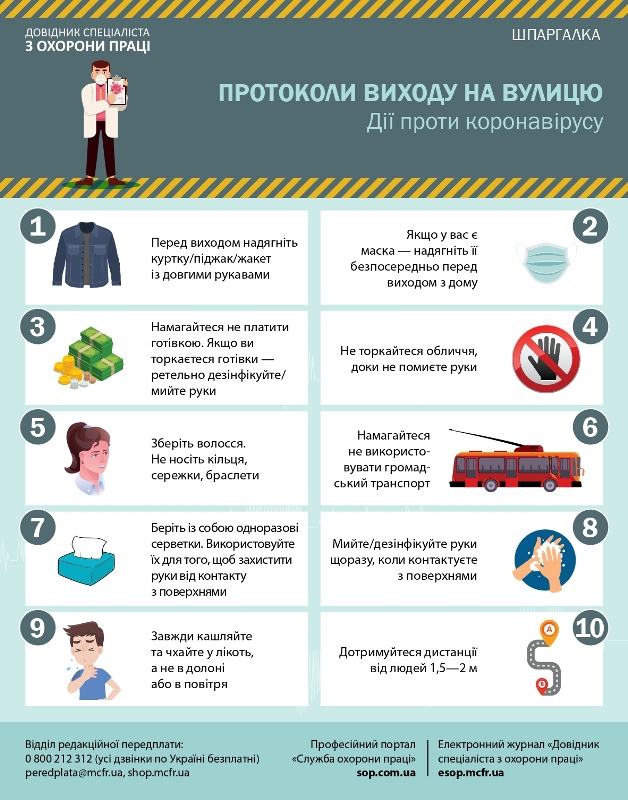 Поясніть працівникам, що наразі єдиний спосіб захиститися – це профілактика. Працівників, що працюють не в дистанційному режимі, забезпечте засобами гігієни та дезінфекції – милом, антисептиками на спиртовій основі, тощо. Запровадьте для них чіткий режим провітрювання через кожні дві години. Контролюйте, як прибирають приміщення. Наголосіть працівникам на ключовому правилі – «Руки – відстань – обличчя»: часто мийте руки теплою водою з милом щонайменше 20 секунд чи обробляйте дезінфекційними засобами зі вмістом спирту щонайменше 60%; уникайте близького контакту з тими, хто кашляє. Відстань – хоча б 1 м; не торкайтеся очей, носа та рота немитими руками. Правила прості, але саме вони разом із імунітетом працюють нашим щитом. Ці правила експерти сформували за рекомендаціями Всесвітньої організації охорони здоров’я (ВООЗ).