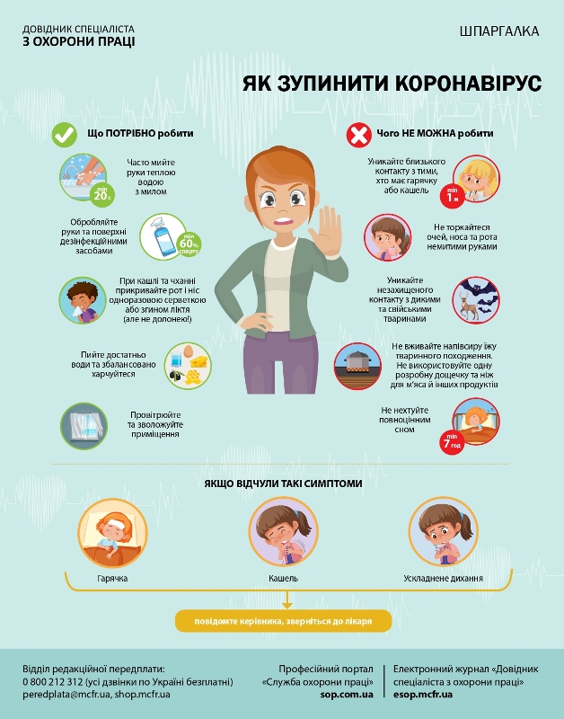 Розмістіть на корпоративному ресурсі відповіді на запитання, що працівники задають найчастіше щодо COVID-19. Проведіть міні-тренінг «Як правильно використовувати захисну маску». Проінформуйте працівників про те, що температура тіла 37,30С – це перший сигнал, що потрібно залишатися вдома. Прийом жарознижувальних препаратів не лікує, а лише маскує інфікування. Пропишіть порядок дій хворого працівника та керівника, наприклад, у правилах внутрішнього трудового розпорядку.