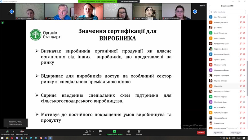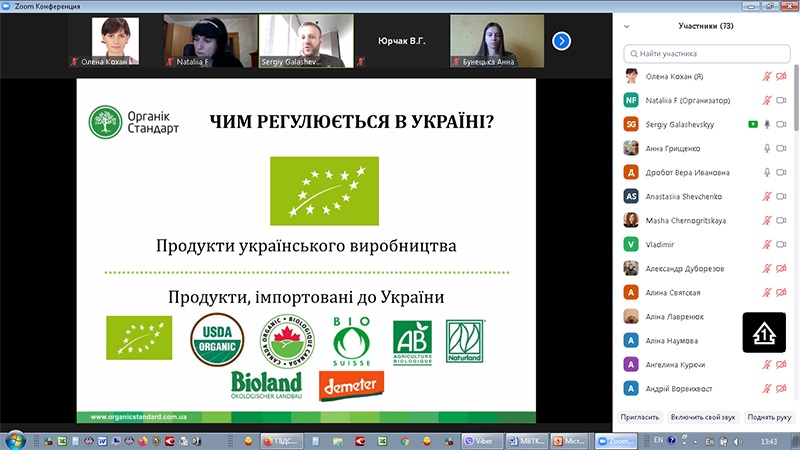 Сергій Галашевський акцентував увагу на важливих принципах виробництва органічних харчових продуктів, їх зберігання та простежуваності на всіх етапах виробництва та реалізації. В презентації була наведена інформація щодо обсягів імпорту органічної сільськогосподарської та переробленої харчової продукції до країн Європейського Союзу, Північної Америки, Азії, Австралії і Океанії. Лектор зробив акцент на перспективах розширення співпраці органічних операторів із закордонними партнерами.