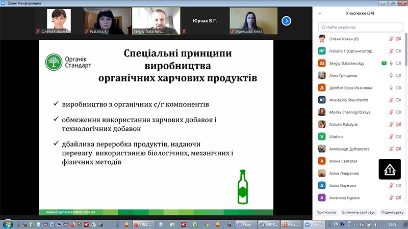 7 квітня 2021 року на кафедрі технології хлібопекарських і кондитерських виробів відбулися гостьова онлайн-лекція та науковий семінар щодо органічного виробництва харчової продукції в Україні та її експорту в різні країни світу. Лекцію прочитав директор ТОВ «Органік стандарт» Сергій Галашевський. Компанія «Органік стандарт» здійснює сертифікацію органічного виробництва в Україні за стандартами ЄС і включена до переліку контролюючих органів, визнаних Європейською Комісією.