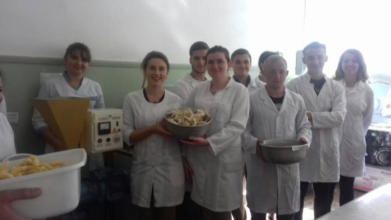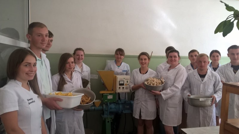 Для студентів демонструвалася робота екструдера при переробленні кукурудзяної крупи, крупи гречаної ядриці, рису та гороху колотого при різних значеннях вихідної вологості. Студенти на початку приготували зразки до екструдування, а частина студентів брала безпосередню участь в екструдуванні при відборі готового продукту, поданні сировини та післяопераційному обслуговуванні обладнання.