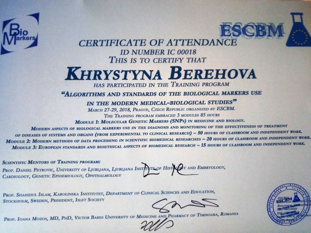 Наприкінці березня компанія Європейський науковий центр «Біомаркери» (ESCBM) організувала тренінг-конференцію для молодих вчених, де вони мали змогу прослухати лекції досвідчених науковців з країн Європейського Союзу та дослідників з країн Східного партнерства, Центральної Азії, Росії та Азії. Асистент кафедри біотехнології і мікробіології Христина Берегова для підвищення професійної кваліфікації вирішила взяти очну участь у роботі цього заходу.