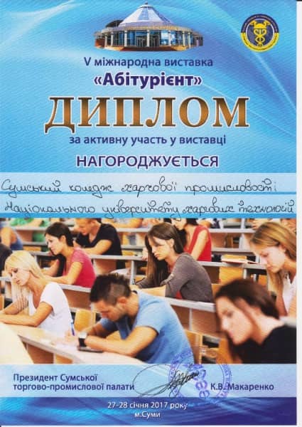 Із метою здійснення профорієнтаційної роботи серед учнівської молоді щодо професійно-вмотивованого вибору місця майбутнього навчання викладачі та студенти Сумського коледжу харчової промисловості нашого університету 27-28 січня 2017 року презентували навчальний заклад на V міжнародній виставці «Абітурієнт», яка відбулась в приміщенні виставкового центру «Іллінський».