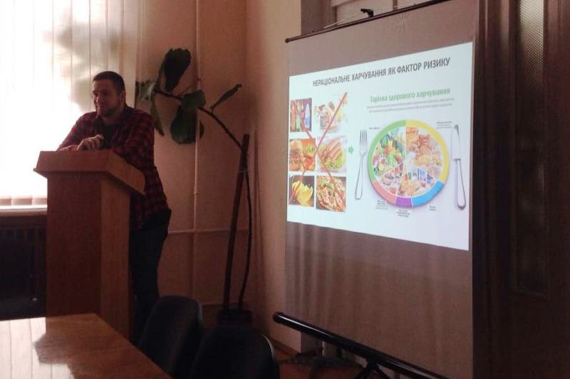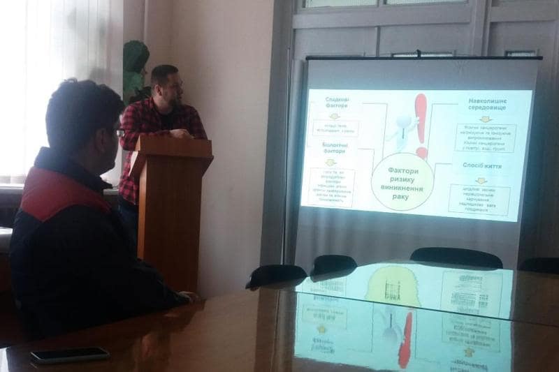 Коротку, проте пізнавальну і дещо дискусійну лекцію, присвячену причинам виникнення раку, прочитав для гостей м.н.с. Тарас Надворний. Студенти активно долучилися до обговорення таких важливих проблем як способи профілактики онкологічних захворювань.