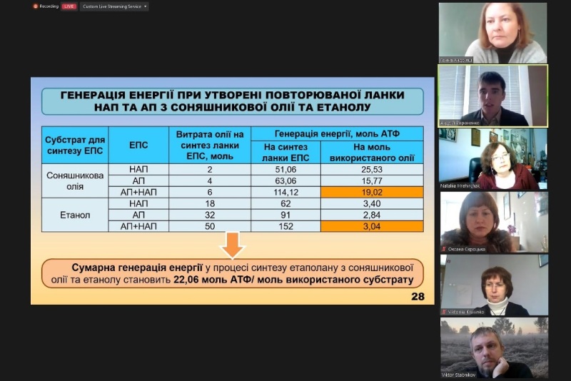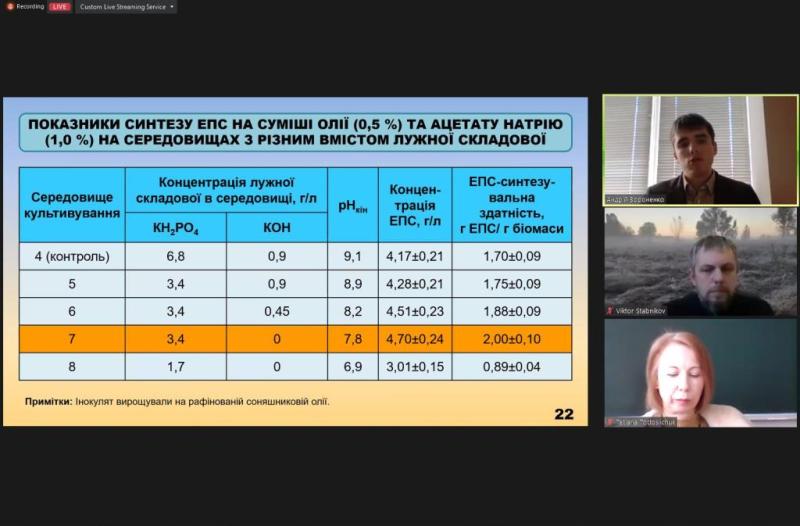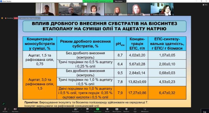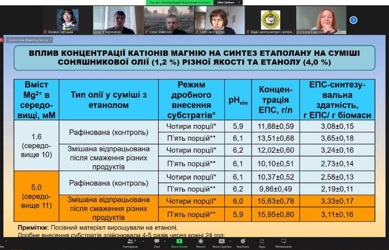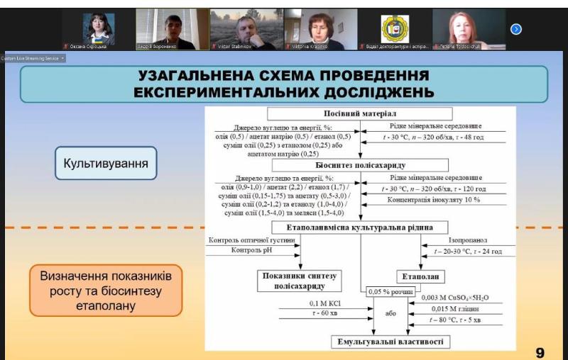Для досягнення поставленої мети здобувачем під час захисту були представлені результати теоретичних та експериментальних досліджень особливостей синтезу етаполану на суміші енергетично нерівноцінних (олія та ацетат, олія та меляса) та енергетично надлишкових (олія та етанол) субстратів, а також продемонстровано можливість успішної заміни рафінованої соняшникової олії у змішаних субстратах на значно дешевшу відпрацьовану олію. Встановлено умови культивування продуцента на досліджуваних змішаних ростових субстратах, при яких концентрація етаполану була найвищою і досягала 16-18 г/л.