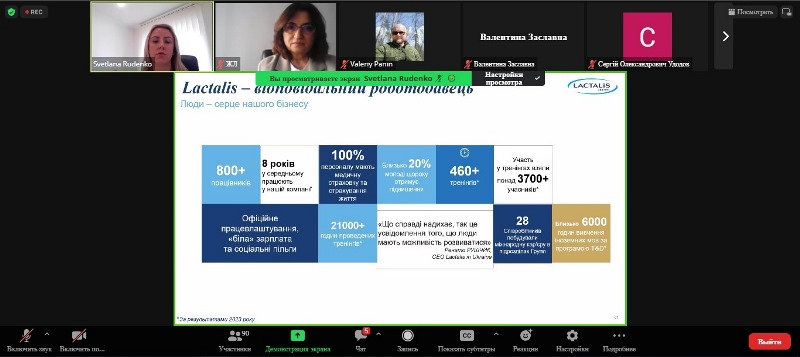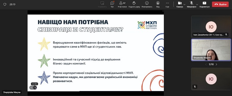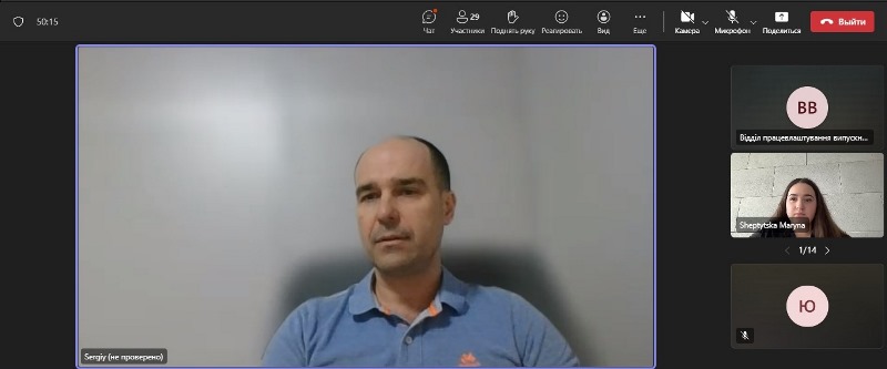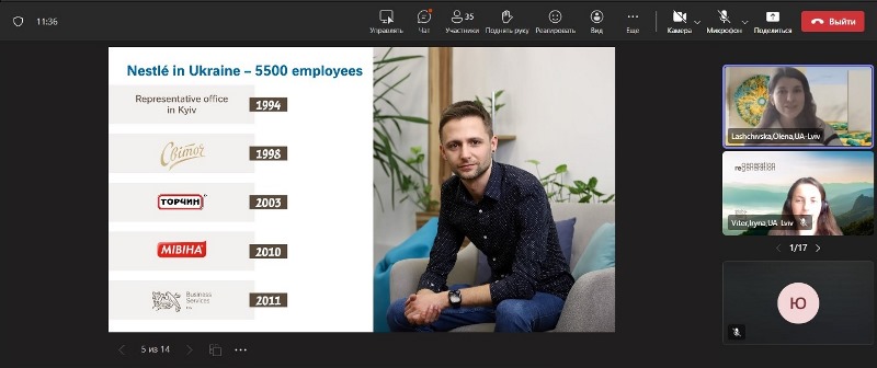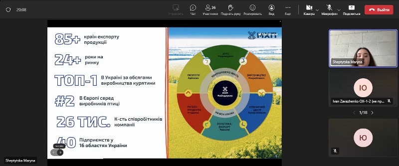 Завжди радісно і цікаво дізнаватися про фахові успіхи наших випускників, а їх у компаніях-учасницях кар’єрного інтенсивну чимало. Багато хто прийшов туди ще студентами, а зараз обіймає керівні посади, і представники підприємств часто саме їх наводять як приклади успішної реалізації себе в професії. Приємно, коли до спілкування долучаються нинішні студенти, що працюють у цих компаніях, і діляться своїм досвідом поєднання роботи з навчанням та враженнями від свого працевлаштування. Як от сьогодні прямо з робочого місця учасників зустрічі з фахівцями ТОВ «Фудком» привітав здобувач четвертого курсу бакалаврату Навчально-наукового інституту харчових технологій Назарій Сафонік, що працює у відділі контролю якості.