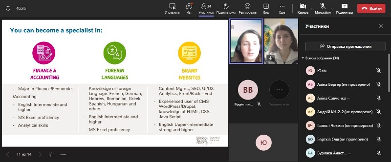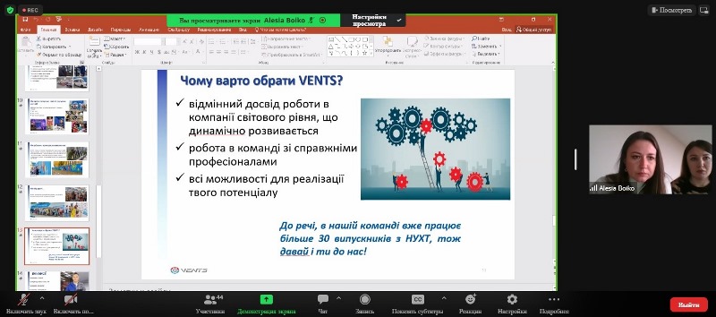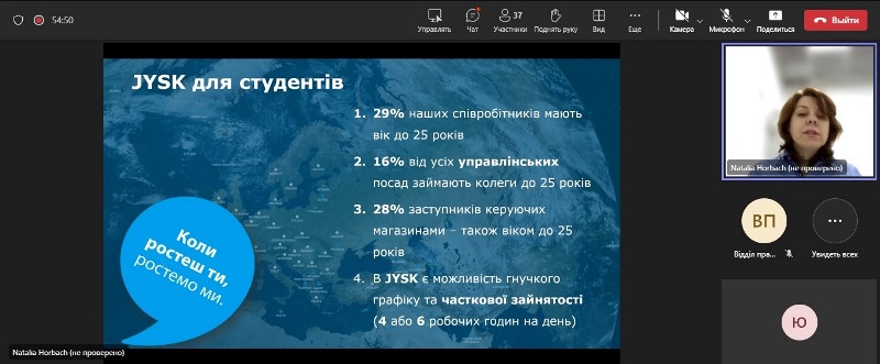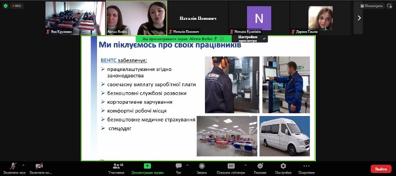 Усі разом дізнавалися про головні тренди ринку праці в Україні в умовах воєнного стану. Докладні презентації наших сьогоднішніх гостей не тільки містили ТОП фактів про діяльність компаній, їх візії й цінності, соціальну відповідальність, досягнення й плани розвитку, але й були зосереджені на тому, що вони можуть запропонувати сьогоднішнім студентам або випускникам – молоді, яка не має досвіду роботи. Екскурсії на підприємства, проходження практики, програми стажування, відкриті вакансії, розраховані саме на студентів, можливості для творчої реалізації, школи лідерства – спектр кар’єрних пропозицій приємно вражає. Особливо цінним є те, що навіть зараз, під час воєнного стану, роботодавці не припиняють підтримувати нашу молодь. Наприклад, компанія «Нестле Бізнес Сервіс в Європі» за час повномасштабного вторгнення прийняла на стажування вже понад 250 молодих людей.
