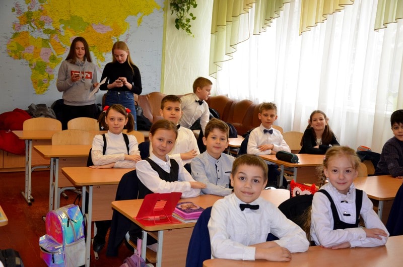 Студентки факультету готельно-ресторанного та туристичного бізнесу Аліна Рябко і Ярина Зацаринна та студент Навчально-наукового інституту економіки і управління Антон Бех разом із викладачем французької мови, доцентом Світланою Мусійчук ознайомили молодших школярів цієї школи з чудовою країною – Францією та її мелодійною співучою мовою. Вони провели інтерактивний урок з «Розумниками», учнями 3-А класу. Діти знайомилися зі способами вітання у французькій мові, з алфавітом, навчилися рахувати до 10, дізналися про зародження зв’язків між Францією і Україною (починаючи від Ярослава Мудрого), а також послухали «Заповіт» французькою мовою у виконанні Антона Беха.