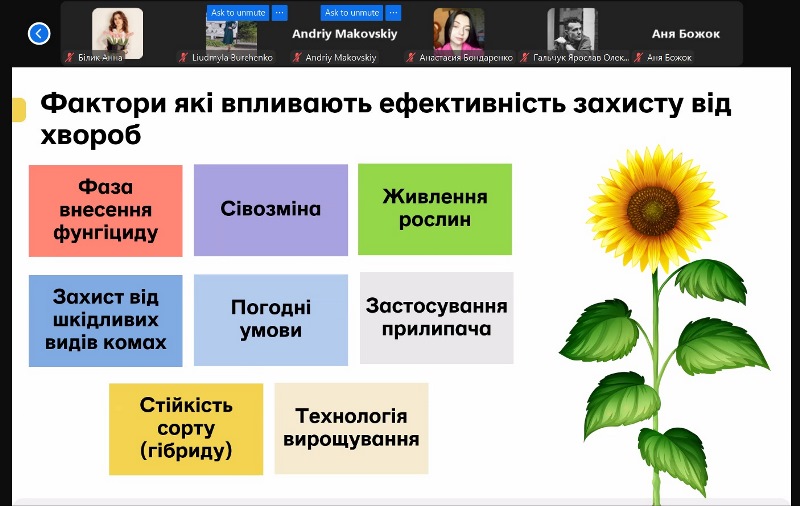Фахівчиня розповіла про технологічні схеми застосування біопрепаратів при органічному землеробстві, ґрунтовно висвітлила фактори, які впливають на ефективність захисту рослин від хвороб, познайомила із засобами захисту рослин, акцентувавши увагу на біологічних. Також доповідачка детально зупинилася на мікроорганізмах, які використовуються в біологічних засобах захисту та послідовності вибору біофунгіцидів і біоінсектицидів.