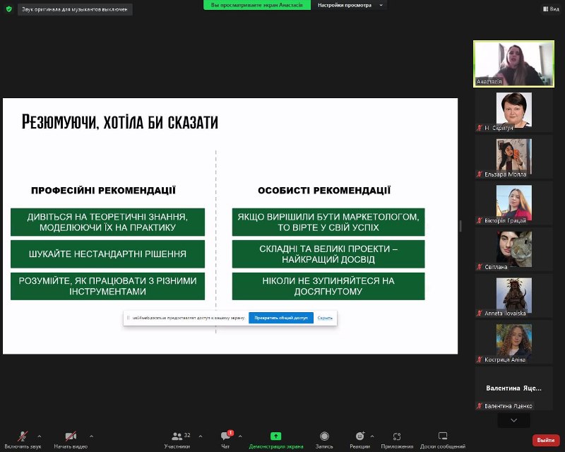 Тематика онлайн-лекції викликала жваву дискусію зі студентами. Такі повчальні і надихаючі зустрічі важливі для майбутніх фахівців у сфері маркетингу. Колектив кафедри маркетингу дякує Анастасії за змістовну та цікаву лекцію, за таку щиру відданість своїй справі й чекає на наступні зустрічі на кафедрі.