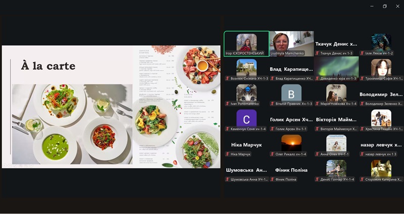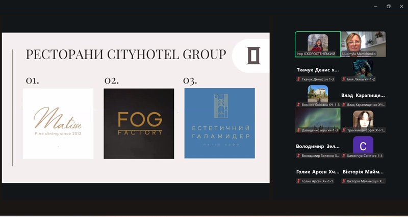 Здобувачі першого курсу освітньої програми «Технології харчування» в межах вивчення дисципліни «Ресторанна справа» прослухали гостьову лекцію «Розвиток закладів ресторанного господарства України. Досвід Cityhotel Residence». Ініціювали захід лекторка дисципліни, доцентка кафедри технології ресторанної і аюрведичної продукції Людмила Мамченко, асистентка кафедри Марія Омельченко та Людмила Борисова, директорка з персоналу Cityhotel і ресторану Matisse, з якими кафедра активно співпрацює.