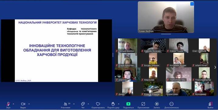 У рамках профорієнтаційної роботи та освітньої діяльності, викладачі кафедри технологічного обладнання та комп’ютерних технологій проєктування, доценти Роман Якобчук і Дмитро Люлька 21 лютого 2025 року прочитали онлайн-лекцію на тему «Інноваційне технологічне обладнання для виготовлення харчової продукції» здобувачам 3-4 курсів спеціальності 133 «Галузеве машинобудування» відокремленого структурного підрозділу «Смілянський технологічний фаховий коледж Національного університету харчових технологій».