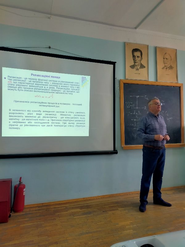 Лектор змістовно ознайомив здобувачів освіти з релаксаційною спектрометрією для дослідження макромолекулярних та олігомерних систем, акцентувавши увагу на важливості вивчення будови та молекулярної рухливості структурних елементів. Також пояснив, з чого складається макромолекулярна система та її дослідження різними методами, при цьому звернувши увагу на те, що якщо синтезувати сполуку шляхом релаксаційної спектрометрії можна дослідити її фізичну структуру.