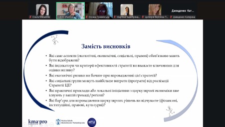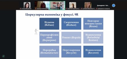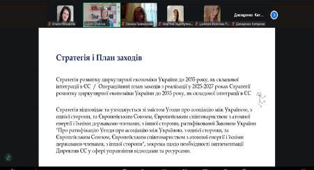 Лекторкою разом зі слухачами було розглянуто ключові положення державної стратегії розвитку циркулярної економіки, її узгодженість із політиками та директивами Європейського Союзу, а також виклики й перспективи впровадження принципів циркулярної економіки в Україні. Особливу увагу фахівчиня приділила питанням сталого розвитку, ефективного використання ресурсів, управління відходами та ролі бізнесу й освіти у трансформації економічної моделі.