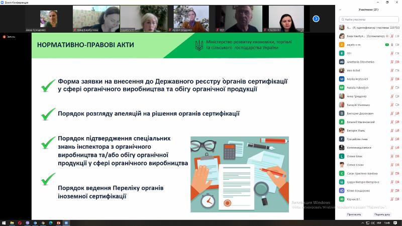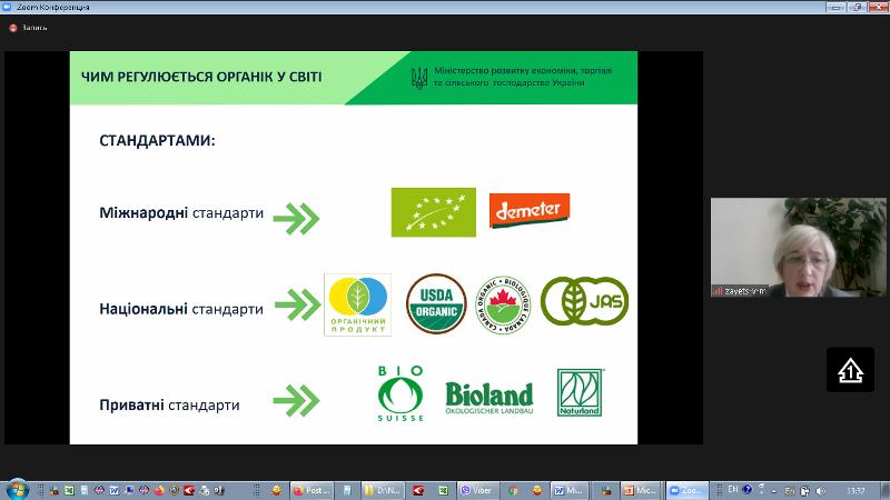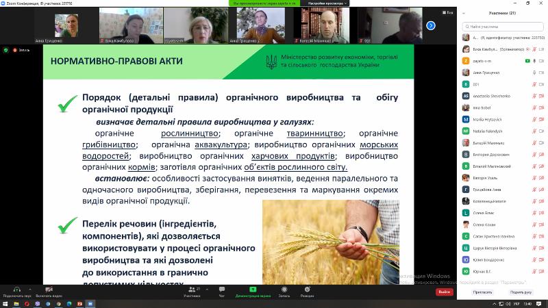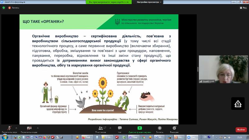 Фахівчиня детально розповіла здобувачам і присутнім викладачам кафедри технології хлібопекарських і кондитерських виробів про основні нормативно-правові акти органічного виробництва в Україні. У лекції також було висвітлено питання щодо маркування органічних продуктів, правил сертифікації виробників органічної продукції, наведені дані про кількість операторів органічного виробництва за кордоном та в Україні. Статистичні дані свідчать, що за останні десятиріччя в усьому світі спостерігається зростання популярності органічного виробництва. Причиною цьому є багато екологічних, економічних і соціальних переваг, що притаманні цій сфері діяльності, які забезпечують покращення якості та безпечності харчування населення та більш ощадливого використання природних ресурсів. Для здобувачів була цікавою та корисною інформація про основні сектори органічного виробництва, що популярні та найбільш потужні в Україні, проблеми, які постають перед виробниками органічної продукції, перспективи збільшення експорту органічної продукції.