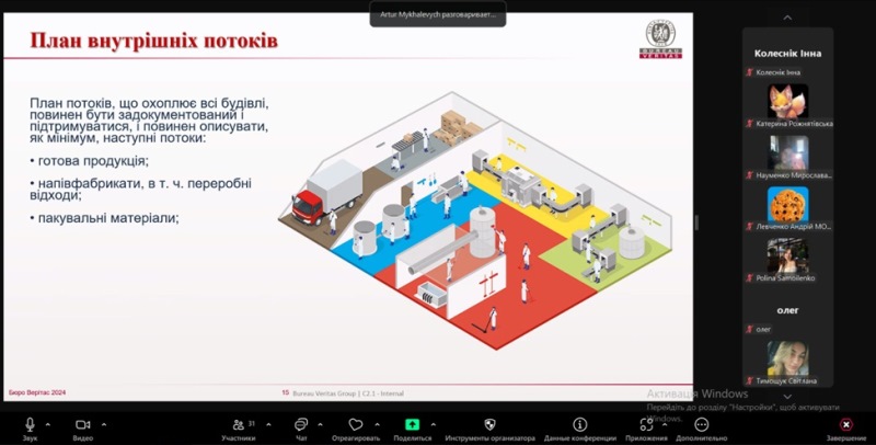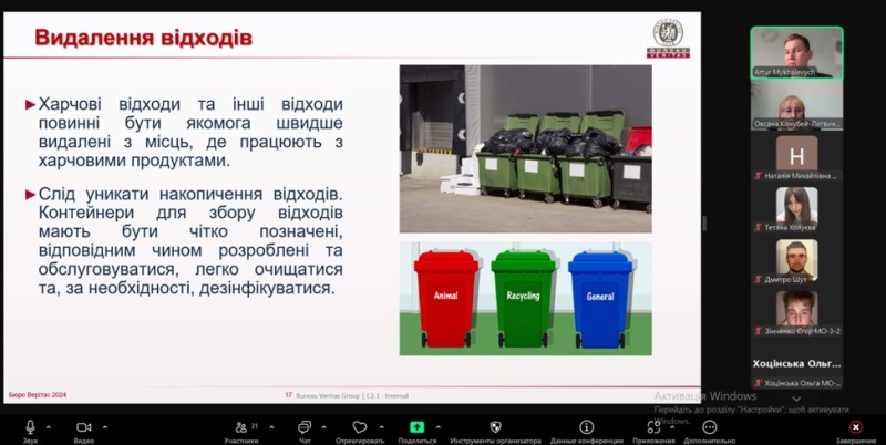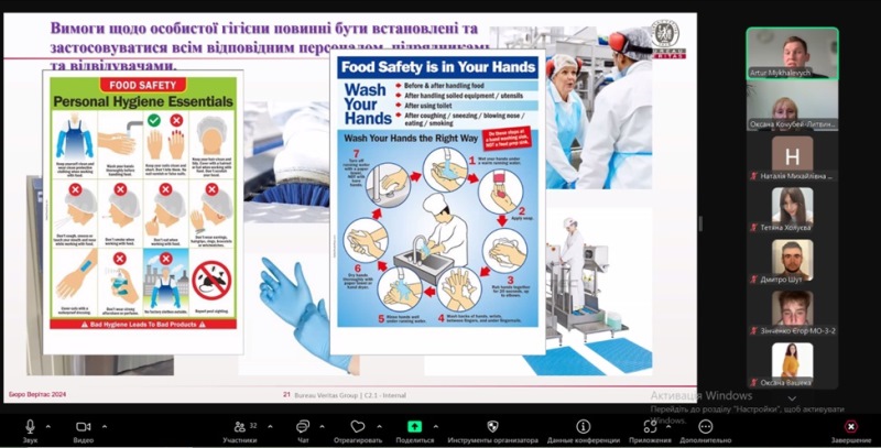 Лектор у захопливій і пізнавальній формі розповів слухачам про дуже важливі для будь-якого харчового підприємства речі – дотримання санітарно-гігієнічних норм у рамках систем менеджменту якості та безпечності. Дуже корисною для майбутніх фахівців була інформація про чинні нормативні документи харчового законодавства щодо дотримання вимог якості та безпечності харчової продукції.