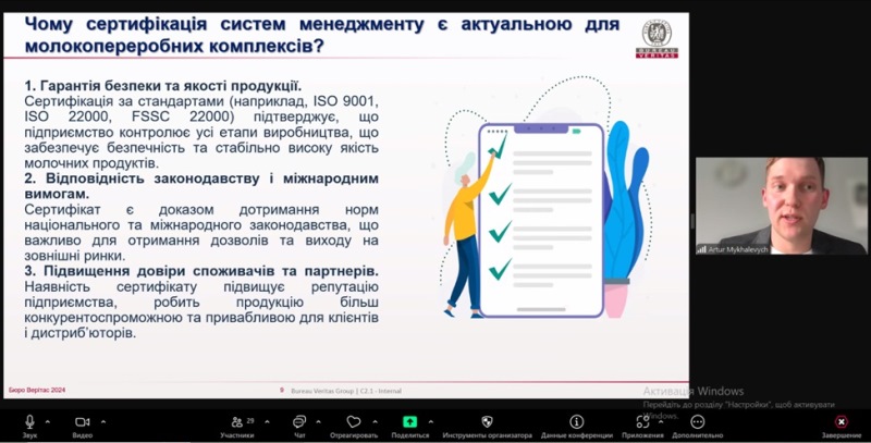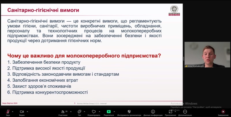 У Навчально-науковому інституті харчових технологій відповідно до графіка проведення гостьових лекцій від вітчизняних фахівців відбулася лекція на тему «Санітарно-гігієнічні вимоги до молокопереробних підприємств в рамках систем менеджменту якості та безпечності». Лектором виступив випускник спеціальності «Харчові технології» 2021 року, а нині – провідний аудитор систем харчової безпечності органу зі сертифікації «ТОВ БЮРО ВЕРІТАС СЕРТИФІКЕЙШН Україна» Артур Михалевич.