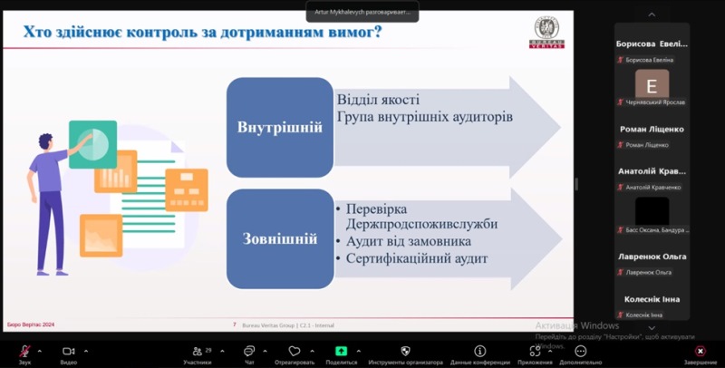 Зустріч відбулася для здобувачів спеціальності «Харчові технології» в межах обов’язкових освітніх компонент «Менеджмент якості та безпечності молочних і молоковмісних продуктів» (освітньо-професійна програма «Технології зберігання, консервування та переробки молока»), «Менеджмент якості та безпечності органічних харчових продуктів» (освітньо-професійна програма «Технології органічних харчових продуктів») освітнього ступеня «Магістр» і «Основи управління якістю та безпечністю харчових продуктів. Модуль 1. Нормативні документи в харчовій промисловості» (освітньо-професійна програма «Харчові технології та інженерія») освітнього ступеня «Бакалавр».