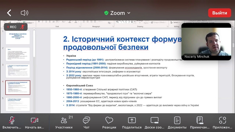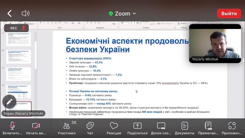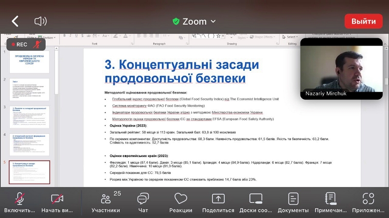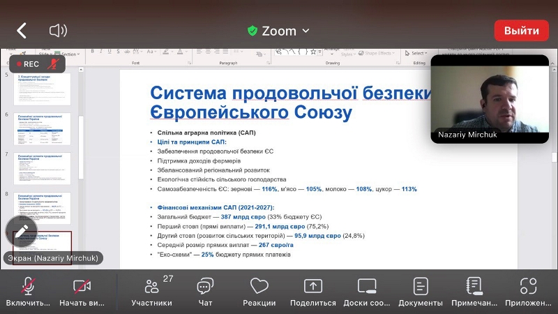 На кафедрі економіки і права відбулася гостьова лекція «Продовольча безпека України та Європейського Союзу» здобувача освітньо-наукового ступеня «Доктор філософії» за спеціальністю «Економіка» Назарія Мірчука.