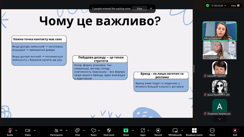 Слухачі дізналися про фундаментальні принципи сучасного бренд-менеджменту та їх практичне застосування. Лекторка на практичних прикладах підкреслила важливу роль емоційного зв’язку між брендом і споживачем у процесі прийняття купівельних рішень. Відзначила, що бренд – це не лише логотип і реклама, а живий організм, що взаємодіє з людьми через значно більшу кількість дотиків і кожна точка дотику має сенс: колір, форма упаковки, тон комунікації, вигляд бренду, освіченість персоналу – все це формує імідж бренду і впливає на взаємодію з аудиторією. На конкретних прикладах продуктів з різним ціновим позиціюванням було продемонстровано, як відрізняється підхід до комунікації та стратегії бренд-менеджменту. Окрема увага була приділена ключовим компетенціям успішного бренд-менеджера.