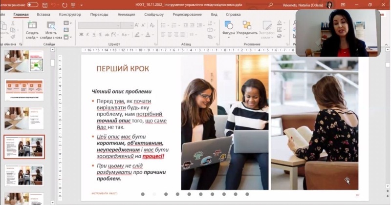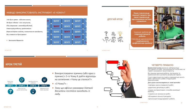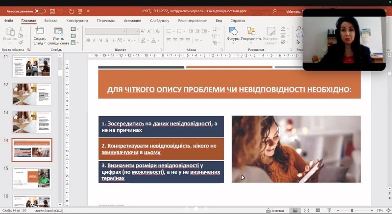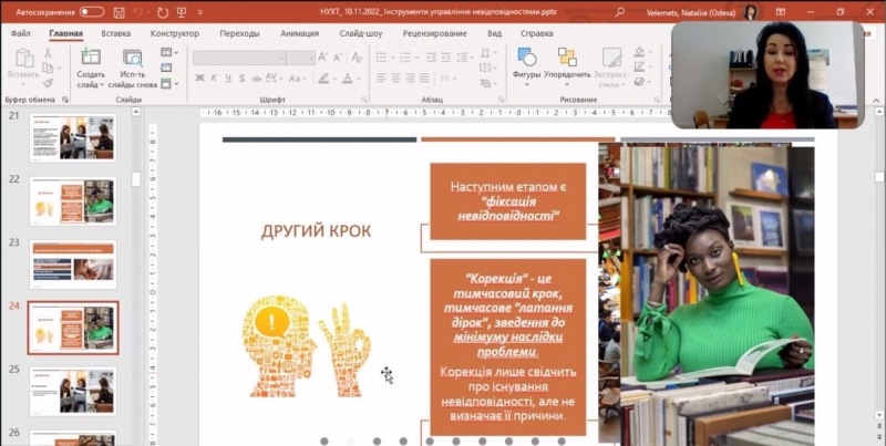 Освітній онлайн-захід від експертки міжнародної компанії був присвячений питанням алгоритмів процесів керування невідповідностями, загальноприйнятим методам аналізу кореневих причин невідповідностей, діаграмі Парето та методу аналізу Парето, матриці пріоритетів Ейзенхауєра та її практичному використанню, графіку Ганта та графіку ПЕРТ.