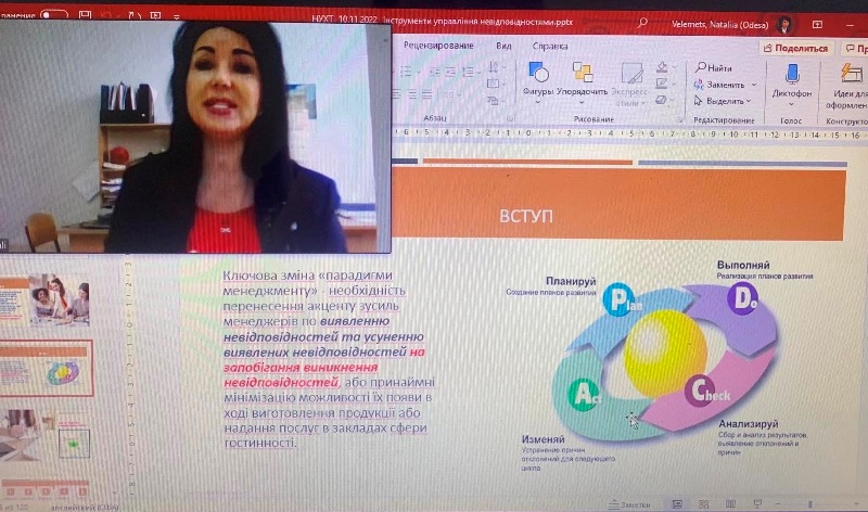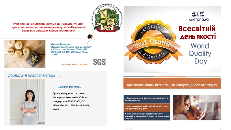 Гостьова спікерка – міжнародна провідна аудиторка систем менеджменту якості та харчової безпеки швейцарської компанії «SGS» по стандартах ISO 9000, ISO 22000, FSSC 22000, BRC FOOD, FSMA, SQMS Наталія Велемець розповіла здобувачам четвертого курсу спеціальності «Готельно-ресторанна справа» про управління невідповідностями та інструменти для вдосконалення систем менеджменту якості та харчової безпеки в закладах сфери гостинності.