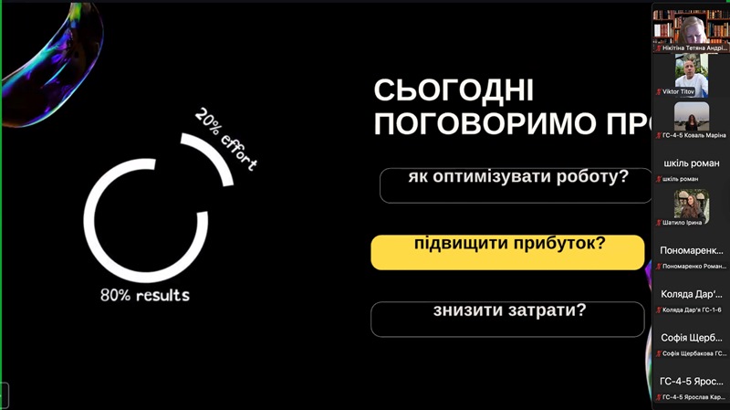 Матеріали доповіді були підкріплені презентацією, яка наочно продемонструвала механізм дії принципу Парето у практичній діяльності сфери HoReCa.