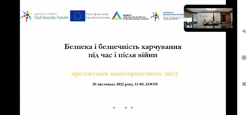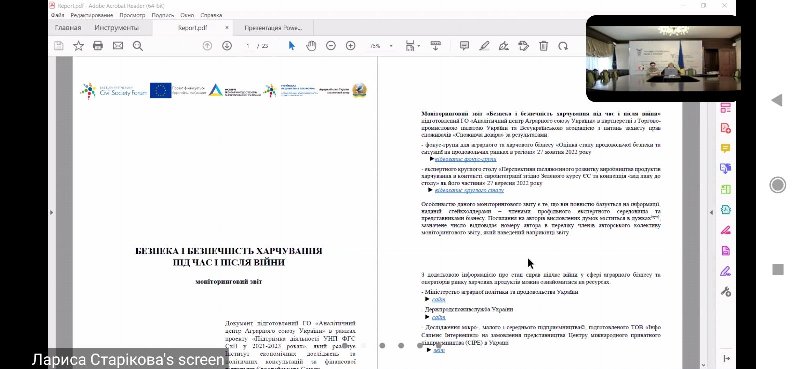 30 листопада 2022 професор кафедри технології ресторанної і аюрведичної продукції Олег Кузьмін і доцентка кафедри експертизи харчових продуктів Оксана Мельник долучилися до презентації моніторингового звіту «Безпека і безпечність харчування під час і після війни», підготовленого ГО «Аналітичний центр Аграрного союзу України» у співпраці з Торгово-промисловою палатою України/Ukrainian CCI та Всеукраїнською асоціацією з питань захисту прав споживачів ВГО «Споживча Довіра» у рамках діяльності Української національної платформи Форуму громадянського суспільства Східного партнерства.