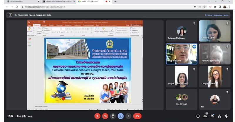 Студентські науково-практичні конференції є важливою складовою організації освітнього процесу у навчально-науковому комплексі нашого університету. У Львівському фаховому коледжі харчової і переробної промисловості НУХТ відбулася студентська науково-практична конференція «Інноваційні тенденції в сучасній цивілізації». В умовах воєнного стану в Україні конференція працювала в форматі онлайн-зустрічі у Meet із прямою трансляцією на YouTube-каналі коледжу.