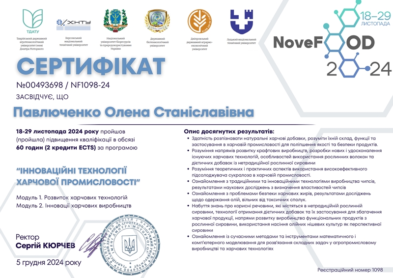 Викладачі кафедри технології ресторанної і аюрведичної продукції, професорка Наталія Фролова, доцентки Ірина Корецька, Людмила Мамченко, Аліна Наконечна, Олена Павлюченко, Ірина Силка, старші викладачі Володимир Польовик і Раїса Матюшенко пройшли підвищення кваліфікації обсягом 60 годин (2 кредити ECST) за програмою «NoveFood-2024», темою «Інноваційні технології харчової промисловості (Модуль 1. Розвиток харчових технологій. Модуль 2. Інновації харчових виробництв)», яке проводив Інститут підвищення кваліфікації Таврійського державного агротехнологічного університету імені Дмитра Моторного разом із закладами освіти-партнерами.