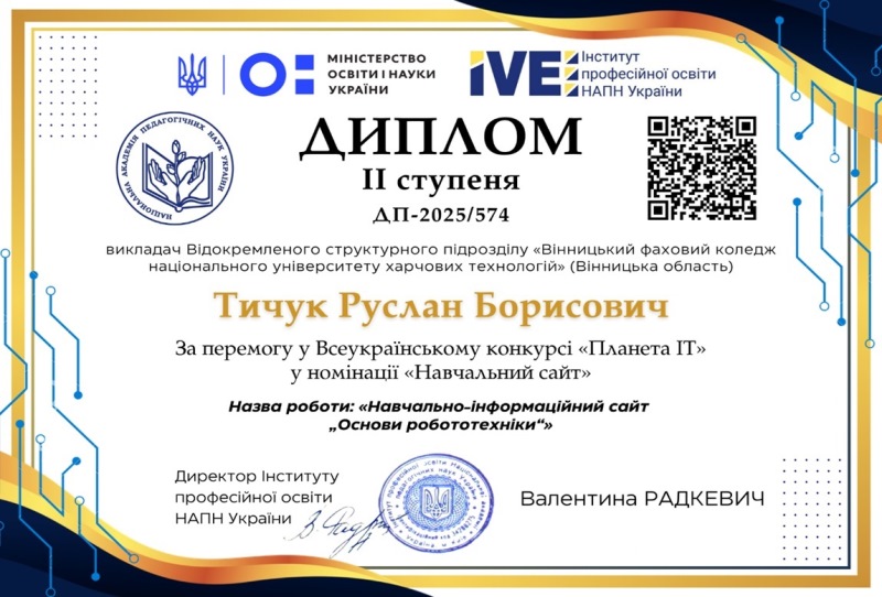 Навчально-інформаційний сайт «Основи робототехніки», створений викладачем Вінницького фахового коледжу НУХТ Русланом Тичуком, відзначений дипломом ІІ ступеня Всеукраїнського конкурсу «Планета ІТ», який проводився Інститутом професійної освіти НАПН України за сприяння директорату професійної освіти Міністерства освіти і науки України для педагогічних працівників закладів професійної та фахової передвищої освіти.